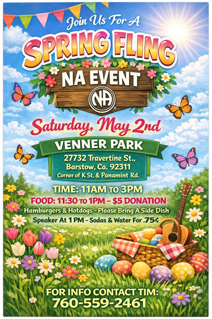 Desert Empire Area 38th Annual Spring Fling Southern California Region of Narcotics Anonymous Posted on March 15, 2026 by Beau MApril 3, 2026 Desert Empire Area 38th Annual Spring Fling 11:00 am – 3:00 pmMay 2, 2026 Venner Park27732 Travertine StreetBarstow, CA 92311View LocationMap Venner Park Google click here for more details View full calendar